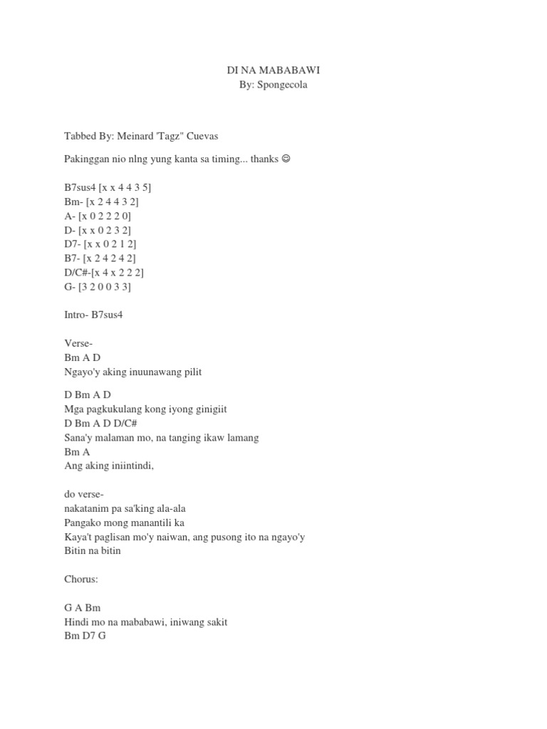 Gib die 2 ziffern ein. Nasa aking guniguni malamig mong tinig Kasabay ng hanging na dumarampi Na para bang ikay nariyan sa aking paligid Tahimik na nagmamasid Repeat Chorus. Acordes Letra y Tablatura de la canción Di Na Mababawi de Sponge Cola.
